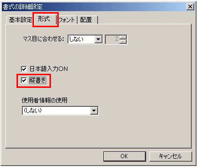 2.「形式」タブで、「縦書き」にチェックをいれ、【OK】を押します。