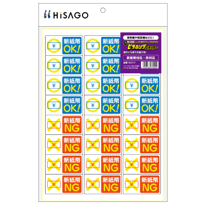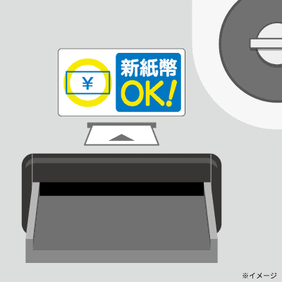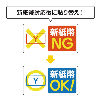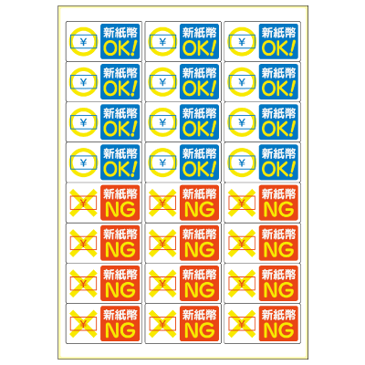 券売機や自動販売機などに貼ることで、新紙幣に対応しているかを表示するステッカーです。
