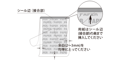 ラミネートする紙を必ずラミネートフィルムのシール部に押し当てて(先端から2~3mmまで)セットしてください。