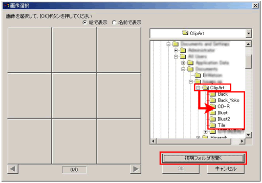 【初期フォルダを開く】ボタンをクリックすると、「ClipArt」フォルダが開きます。ヒサゴ工房の無料イラストは、[Clip Art]フォルダ以下の[Back]、[Back_Yoko] 、[CD-R]、[Illust]、[Illust2]、[Tile]各フォルダに収録されています。右側のフォルダ選択領域でいずれかのフォルダをクリックすると、無料イラストが表示されます。