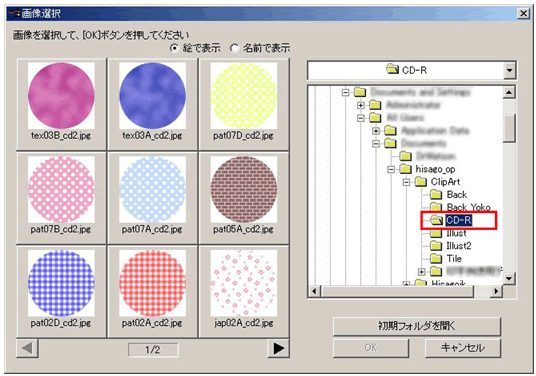 2.画像スペースをダブルクリックし、「画像選択」画面を表示させ、ヒサゴ工房の無料イラスト[Clip Art]-[CD-R]フォルダから、お好みの円形のイラストを選択します。