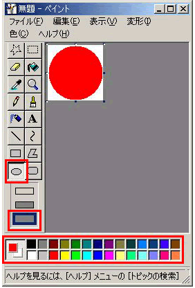 3.カラーボックスから「色」と、オプションボックスの塗りつぶしオプションの種類で3番目(一番下)を選択します。ツールボックスの【だ円】ボタンをクリックします。