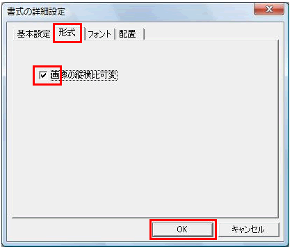 2.スペースの「書式の詳細設定」が表示されますので、「形式」タブをクリックします。「画像の縦横比可変」にチェックを入れて、【OK】ボタンを押します。