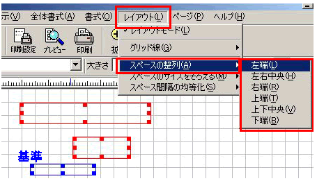 2.メニューの[レイアウト]-[スペースの整列]から「幅」/「高さ」/「幅・高さ」のいずれかを選択します。