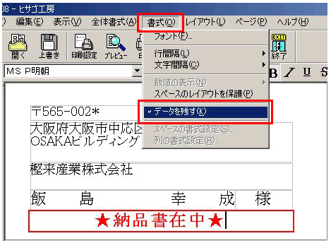 (例)「★納品書在中★」の文字は、[データを残す]にチェックを入れていないと、宛名のデータを流し込むと消えてしまいますが、チェックを入れておくと、そのまま残ります。