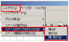 2.メニューの[レイアウト]-[スペースのサイズを揃える]から「幅」/「高さ」/「幅・高さ」のいずれかを選択します。