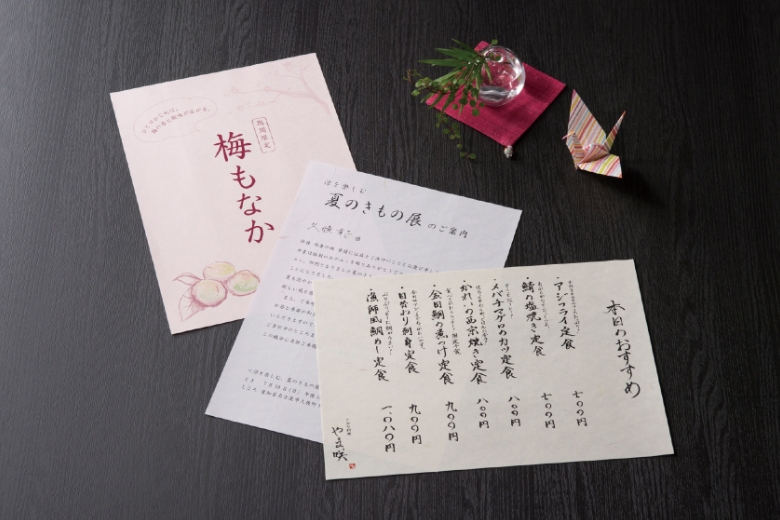 抗菌加工が施されたラミネートフィルムや、和の風合いのある用紙をご用意しています。 お店の雰囲気に合わせたオリジナルのメニュー表やショップカードなどの作成に。