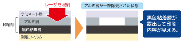 ※その他のレーザマーカーや印刷プリンタではご使用いただけません。 - ● 多層構造となっており、レーザを照射してラベル内部のアルミ層を除去し、下の黒色粘着層を露出させることで文字を印刷します。そのため、摩擦などにより印刷内容が消える心配がなく、改ざん防止策におすすめです。また、表面にラミネート加工を施しているため耐久性に優れています。