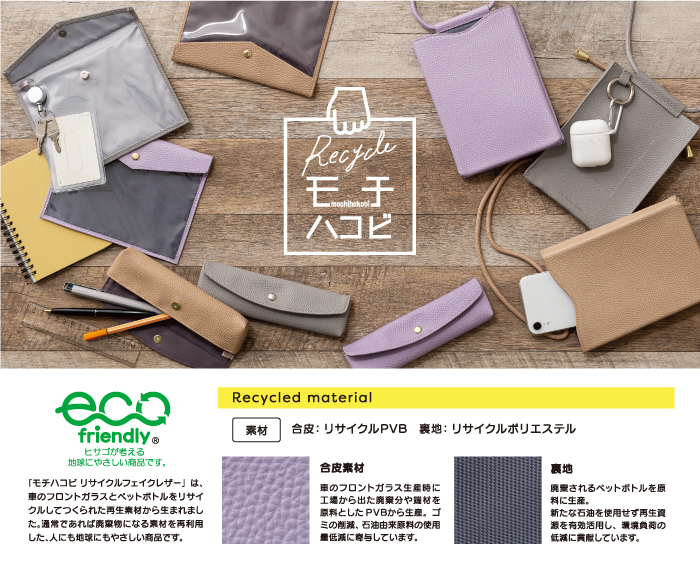 車のフロントガラスとペットボトルから作られたリサイクルフェイクレザー使用の「モチハコビ」シリーズ発売