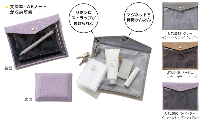 透明ポケットで中身が見やすく、文庫本やA6ノートの持ち運びにちょうど良いサイズ。