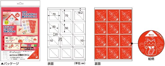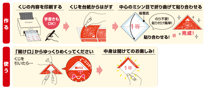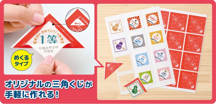 - ● 印刷してからはがして貼り合わせるだけ!はさみ・のり不要で本格的なオリジナル三角くじを作ることができます。