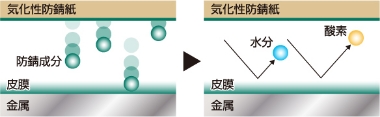 金属製品を「包む」あるいは密封容器に「同梱する」ことで、気化した薬剤が金属製品の表面に皮膜を作り、錆の原因となる水分や酸素の侵入を防いで金属製品を錆びにくくします。