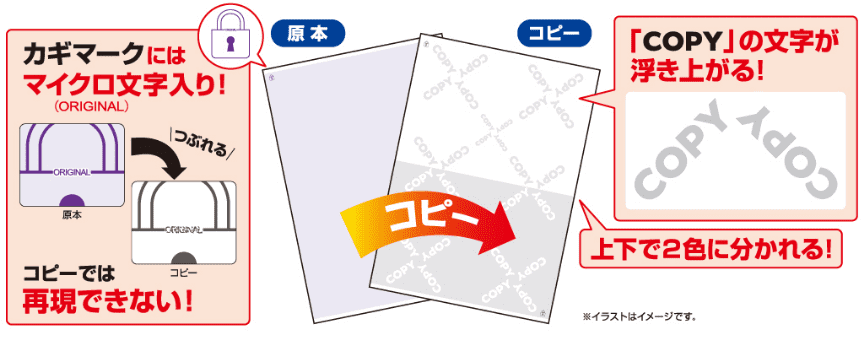 - ● 特殊な技術を複数組み合わせることで、原本とコピーが判別できるコピー判別用紙です。
