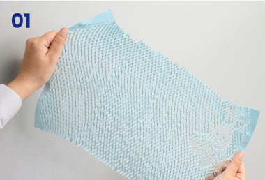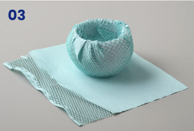 細かく入った切り込みを左右に引っ張り、立体的な網目状にして包むことで、外部からの衝撃を和らげます。