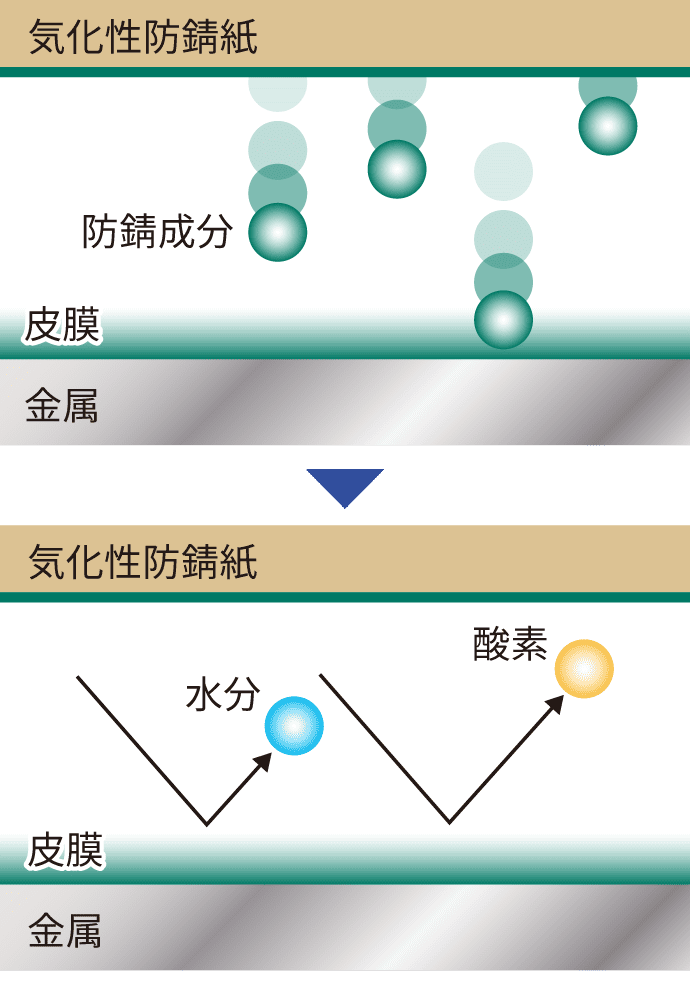「包む」あるいは密封容器に「同梱する」ことで、気化性防錆剤が気化し金属の表面に皮膜を作ります。