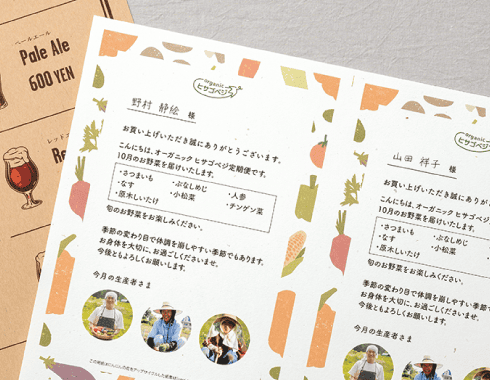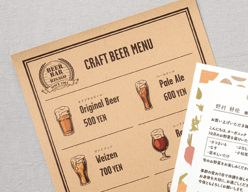 案内状やエシカル商品のPOP・メニューなど、素材と風合いを選んでご使用いただけます。